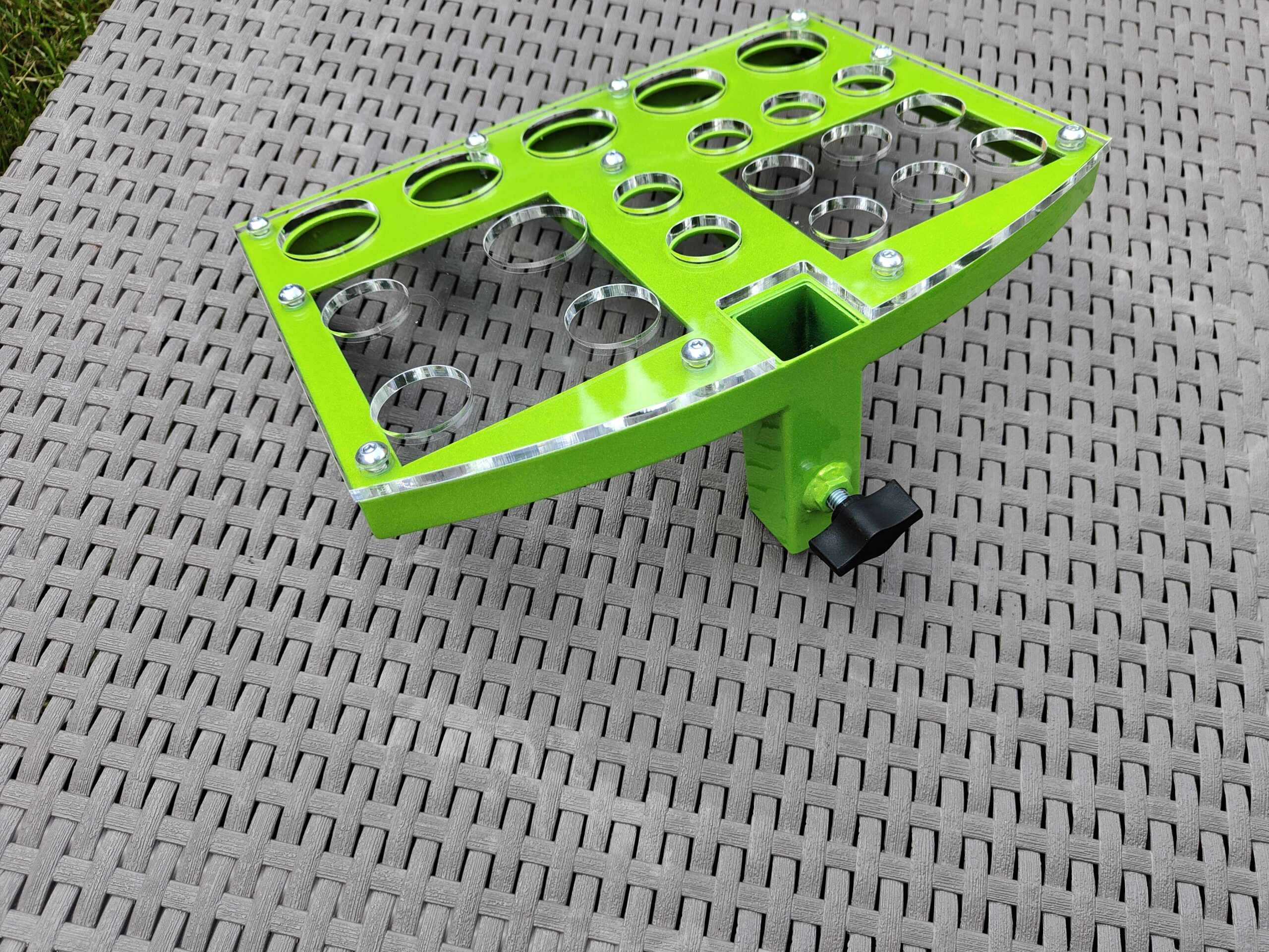 Przybornik pasuje do wysięgników o szerokości 25×25 mm i 30×30 mm.