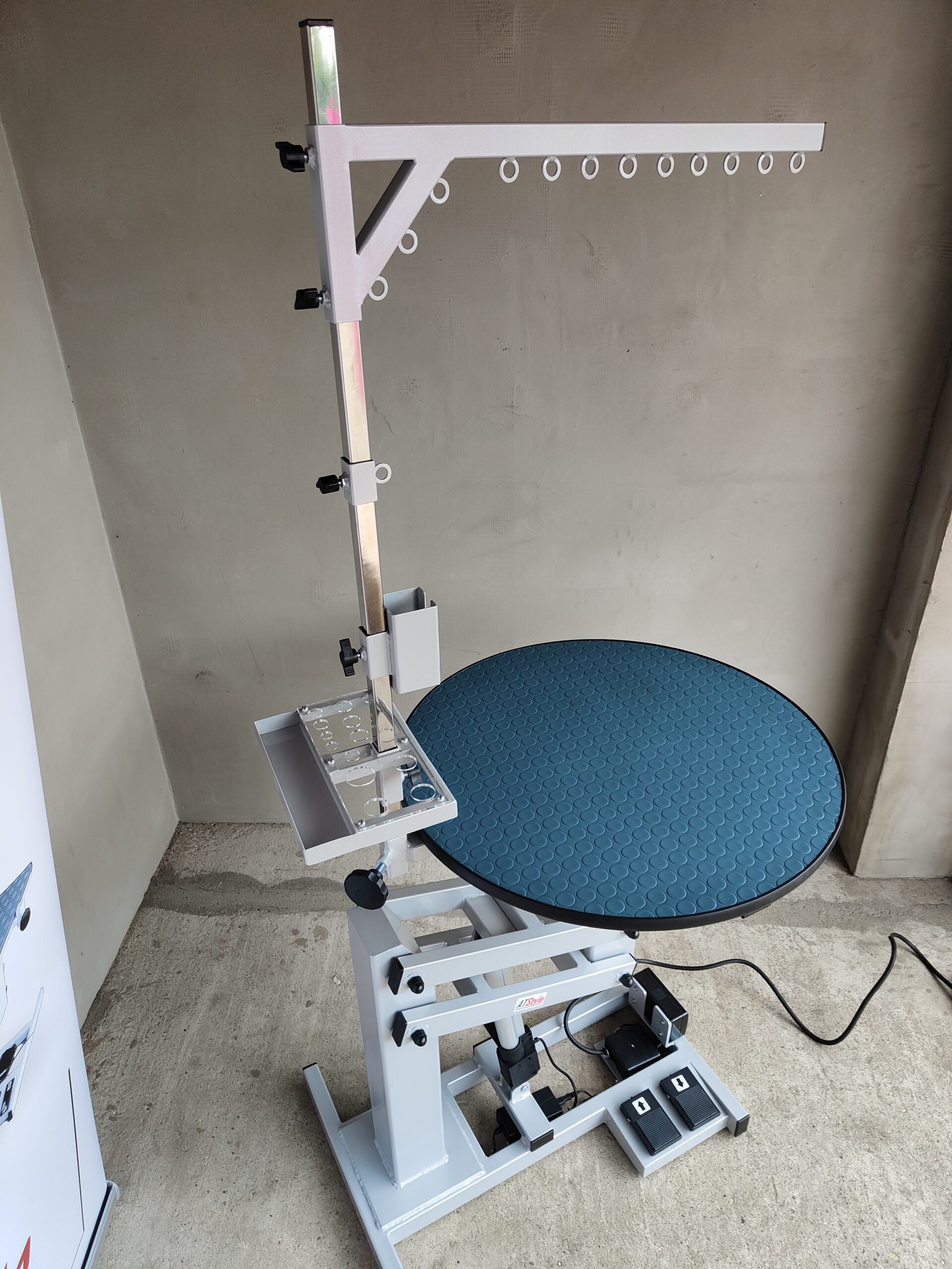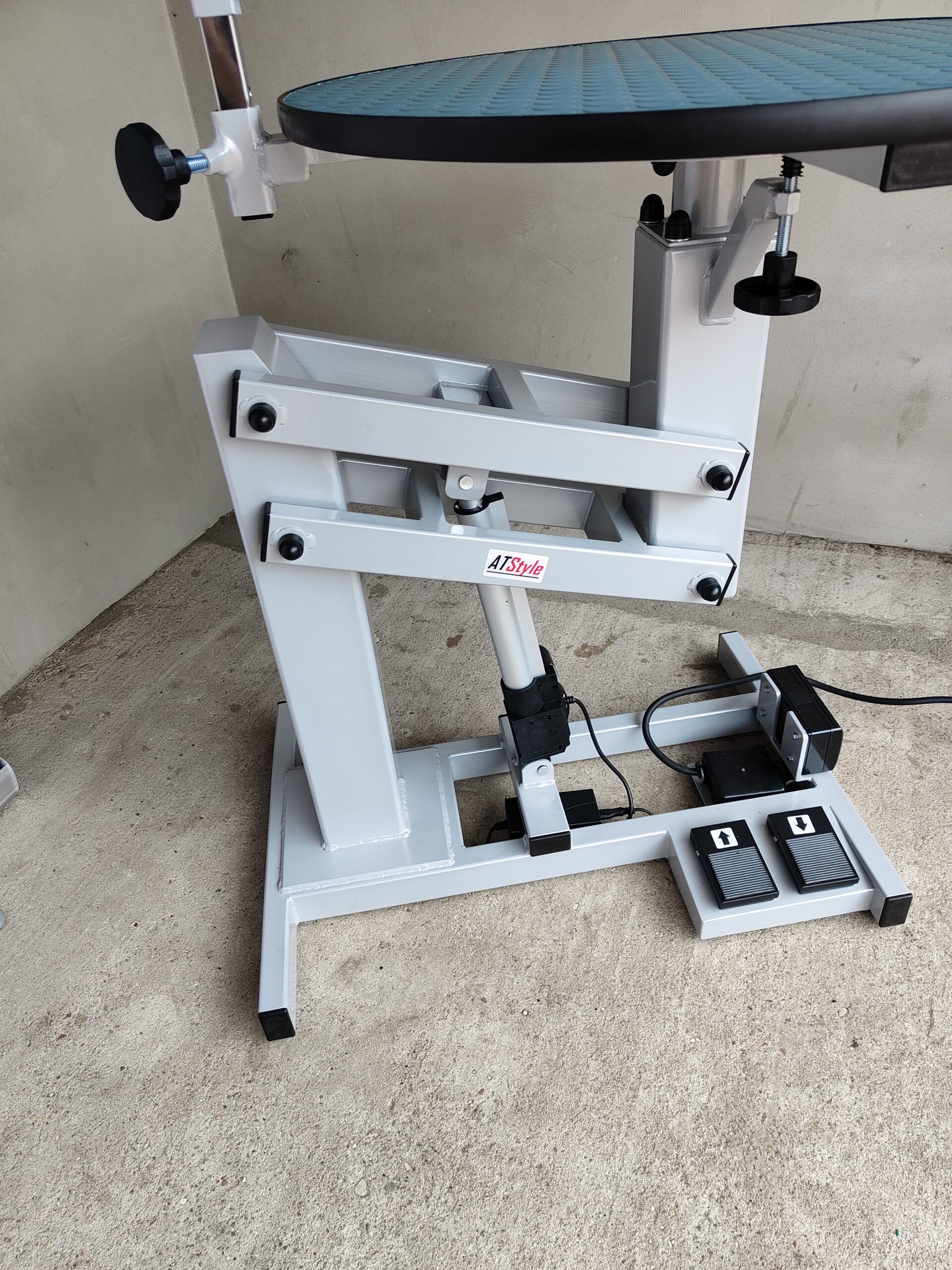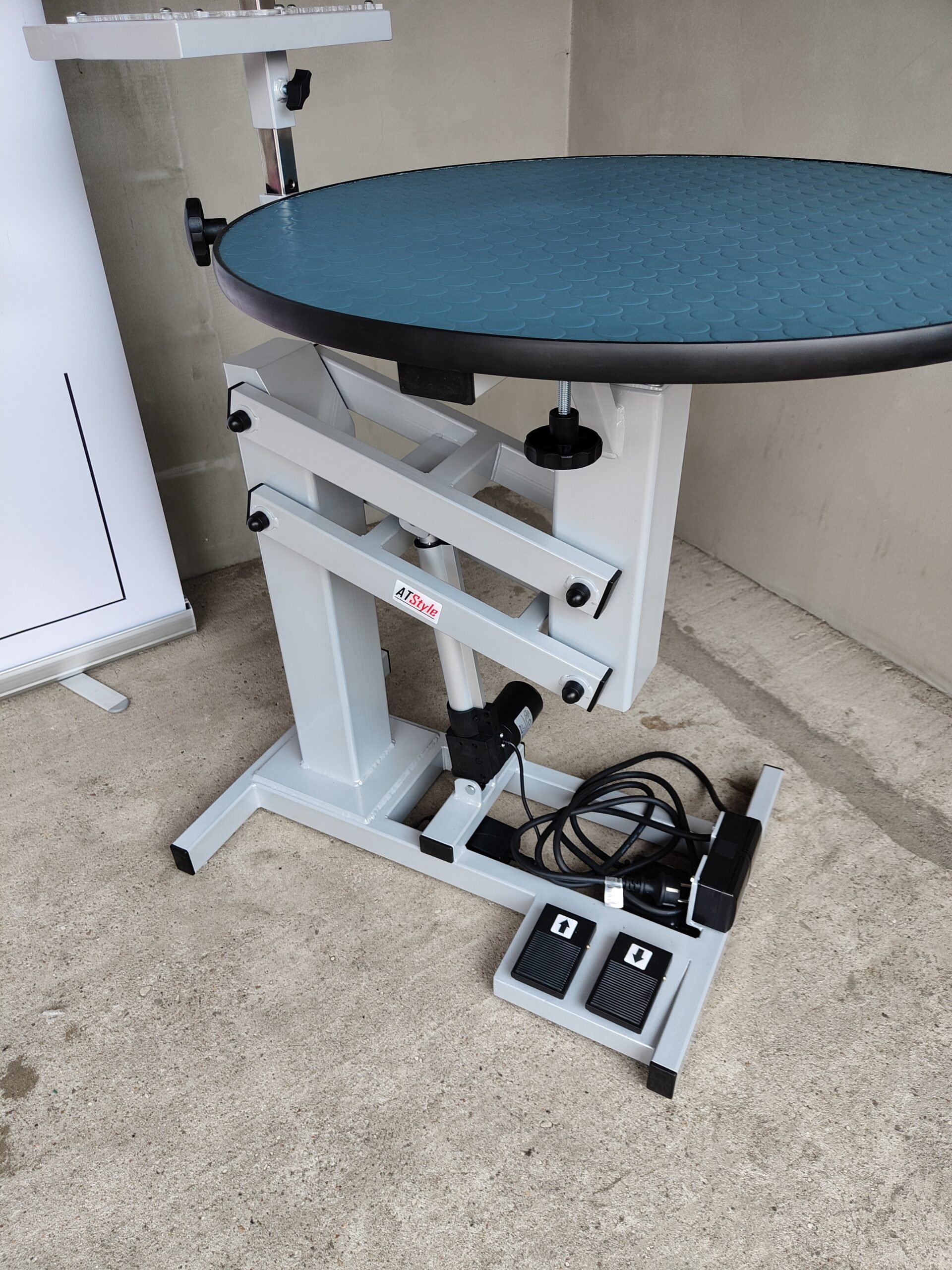 STÓŁ GROOMERSKI na podnośniku elektrycznym okrągły blat 69 cm szary aluminium